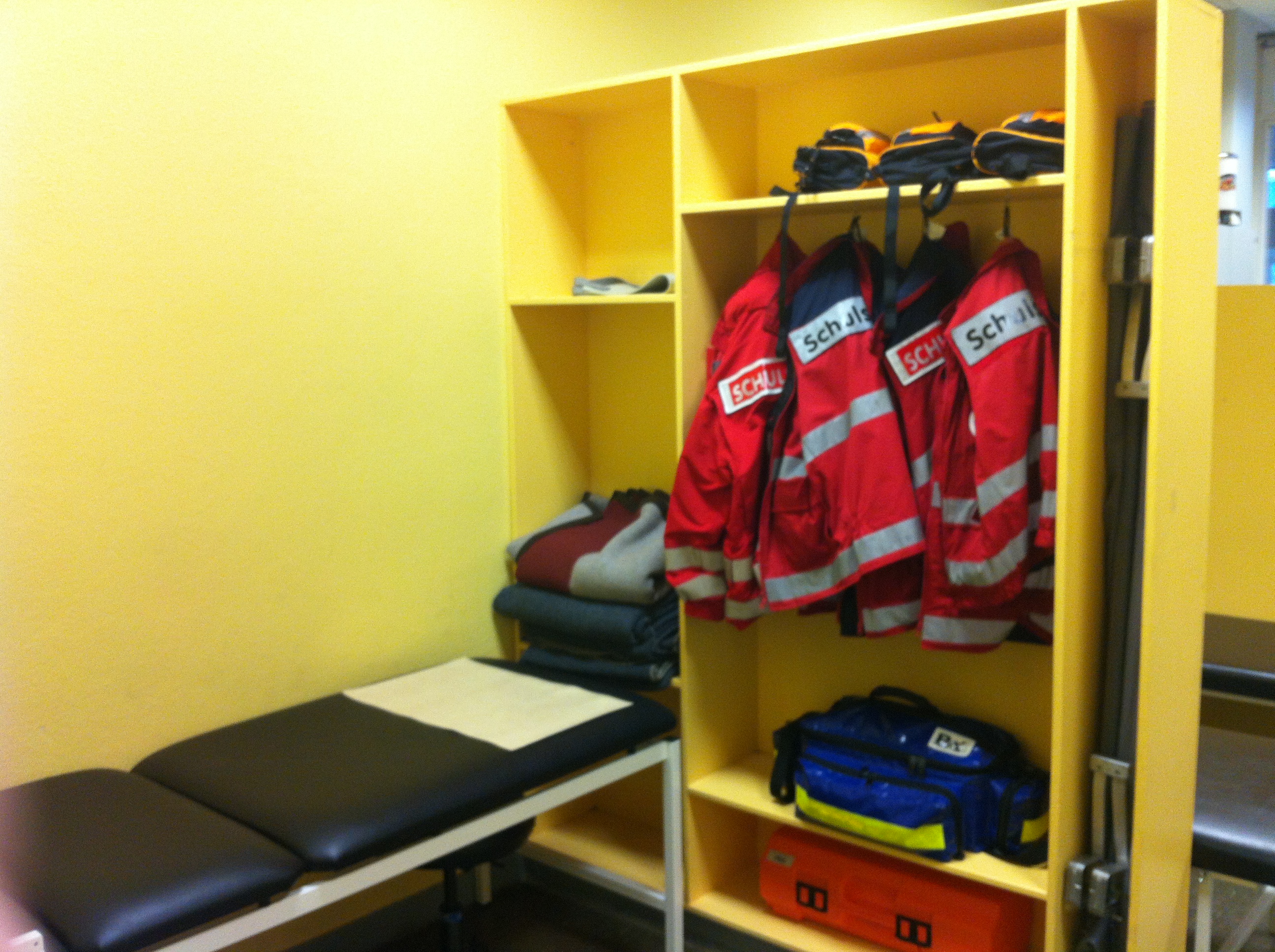 Im Anschluss an die kleine Diskussionsrunde zeigte uns Torsten Huber die „heiligen Hallen“ eines jeden Schulsanitätsdienstes: das Arztzimmer. Eingeteilt in zwei Abteilungen bietet das Arztzimmer an der Theodor-Heuss-Realschule viel Platz für alle Wehwehchen. „Von Knochenheiler bis Seelenklempner sind wir alles“, so Huber. Die SSD‘ler der Theodor-Heuss-Realschule sind professionell ausgestattet mit Sauerstoff und fahrbarer Krankenliege. Bei jedem Einsatz, bei dem sie anders als an den KS-OG über Funk alarmiert werden, geht beides mit.